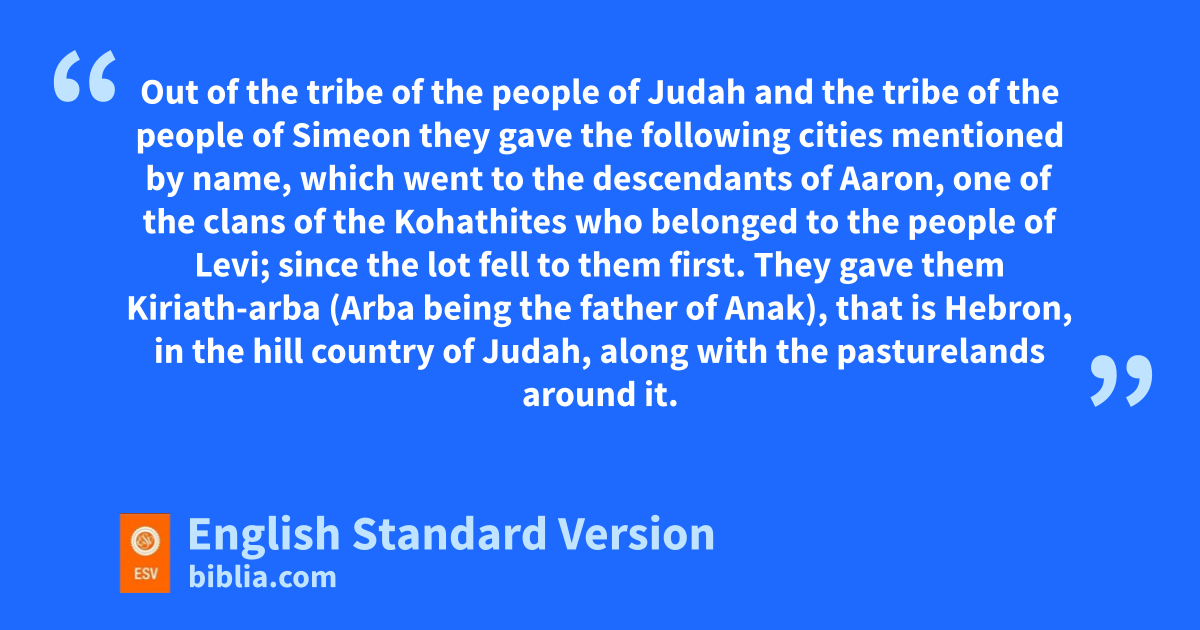 9 Out of the tribe of the people of Judah and the tribe of the people of Simeon they gave the following cities mentioned by name, 10 which went to dthe descendants of Aaron, one of the clans of the Kohathites who belonged to the people of Levi; since the lot fell to them first. 11 eThey gave them fKiriath-arba (Arba being the father of Anak), that is Hebron, gin the hill country of Judah, along with the pasturelands around it. 12 But the fields of the city and its villages had been given to Caleb the son of Jephunneh as his possession.