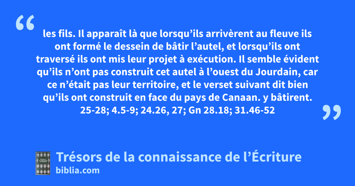 les fils. Il apparaît là que lorsqu’ils arrivèrent au fleuve ils ont formé le dessein de bâtir l’autel, et lorsqu’ils ont traversé ils ont mis leur projet à exécution. Il semble évident qu’ils n’ont pas construit cet autel à l’ouest du Jourdain, car ce n’était pas leur territoire, et le verset suivant dit bien qu’ils ont construit en face du pays de Canaan. y bâtirent. 25-28; 4.5-9; 24.26, 27; Gn 28.18; 31.46-52