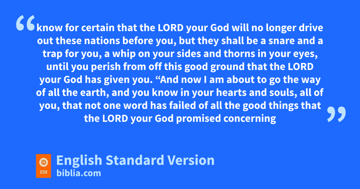 23 A long time afterward, when the Lord had given erest to Israel from all their surrounding enemies, and Joshua fwas old and well advanced in years, 2 Joshua gsummoned all Israel, its elders and heads, its judges and officers, and said to them, “I am now old and well advanced in years. 3 And you have seen all that the Lord your God has done to all these nations for your sake, hfor it is the Lord your God who has fought for you. 4 Behold, iI have allotted to you as an inheritance for your tribes those nations that remain, along with all the nations that I have already cut off, from the Jordan to the Great Sea in the west. 5 The Lord your God jwill push them back before you and drive them out of your sight. And you shall possess their land, kjust as the Lord your God promised you. 6 Therefore, lbe very strong to keep and to do all that is written in the Book of the Law of Moses, mturning aside from it neither to the right hand nor to the left, 7 nthat you may not mix with these nations remaining among you oor make mention of the names of their gods por swear by them or serve them or bow down to them, 8 qbut you shall cling to the Lord your God just as you have done to this day. 9 rFor the Lord has driven out before you great and strong nations. And as for you, sno man has been able to stand before you to this day. 10 tOne man of you puts to flight a thousand, since it is the Lord your God uwho fights for you, just as he promised you. 11 vBe very careful, therefore, to love the Lord your God. 12 For if you turn back and cling to the remnant of these nations remaining among you wand make marriages with them, so that you associate with them and they with you, 13 know for certain that xthe Lord your God will no longer drive out these nations before you, ybut they shall be a snare and a trap for you, a whip on your sides and thorns in your eyes, until you perish from off this good ground that the Lord your God has given you.