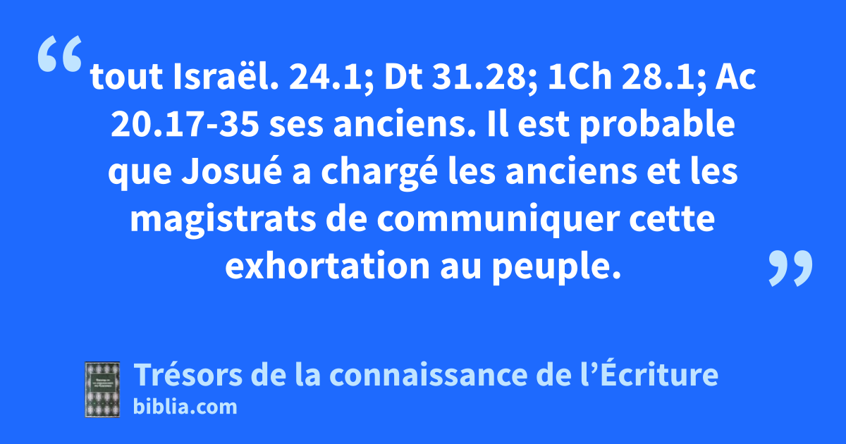 tout Israël. 24.1; Dt 31.28; 1Ch 28.1; Ac 20.17-35 ses anciens. Il est probable que Josué a chargé les anciens et les magistrats de communiquer cette exhortation au peuple.