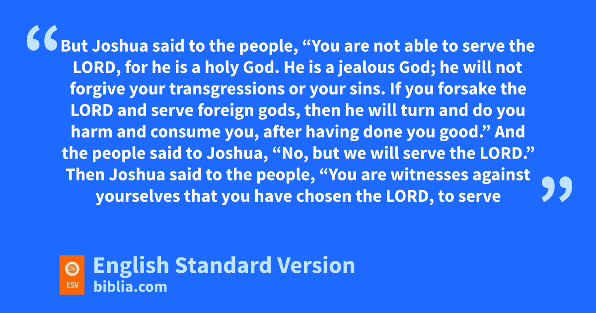 19 But Joshua said to the people, “You are not able to serve the Lord, for he is ma holy God. He is na jealous God; ohe will not forgive your transgressions or your sins. 20 pIf you forsake the Lord and serve foreign gods, then qhe will turn and do you harm and consume you, after having done you good.” 21 And the people said to Joshua, “No, but we will serve the Lord.” 22 Then Joshua said to the people, “You are witnesses against yourselves that ryou have chosen the Lord, to serve him.” And they said, “We are witnesses.” 23 He said, “Then sput away the foreign gods that are among you, and incline your heart to the Lord, the God of Israel.” 24 And the people said to Joshua, “The Lord our God we will serve, and his voice we will obey.” 25 So Joshua tmade a covenant with the people that day, and put in place ustatutes and rules for them at Shechem. 26 And Joshua vwrote these words in the Book of the Law of God. And whe took a large stone and set it up there xunder the terebinth that was by the sanctuary of the Lord. 27 And Joshua said to all the people, “Behold, ythis stone shall be a witness against us, for zit has heard all the words of the Lord that he spoke to us. Therefore it shall be a witness against you, lest you deal falsely with your God.” 28 So Joshua asent the people away, every man to his inheritance.