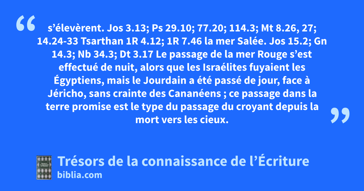s’élevèrent. Jos 3.13; Ps 29.10; 77.20; 114.3; Mt 8.26, 27; 14.24-33 Tsarthan 1R 4.12; 1R 7.46 la mer Salée. Jos 15.2; Gn 14.3; Nb 34.3; Dt 3.17 Le passage de la mer Rouge s’est effectué de nuit, alors que les Israélites fuyaient les Égyptiens, mais le Jourdain a été passé de jour, face à Jéricho, sans crainte des Cananéens ; ce passage dans la terre promise est le type du passage du croyant depuis la mort vers les cieux.
