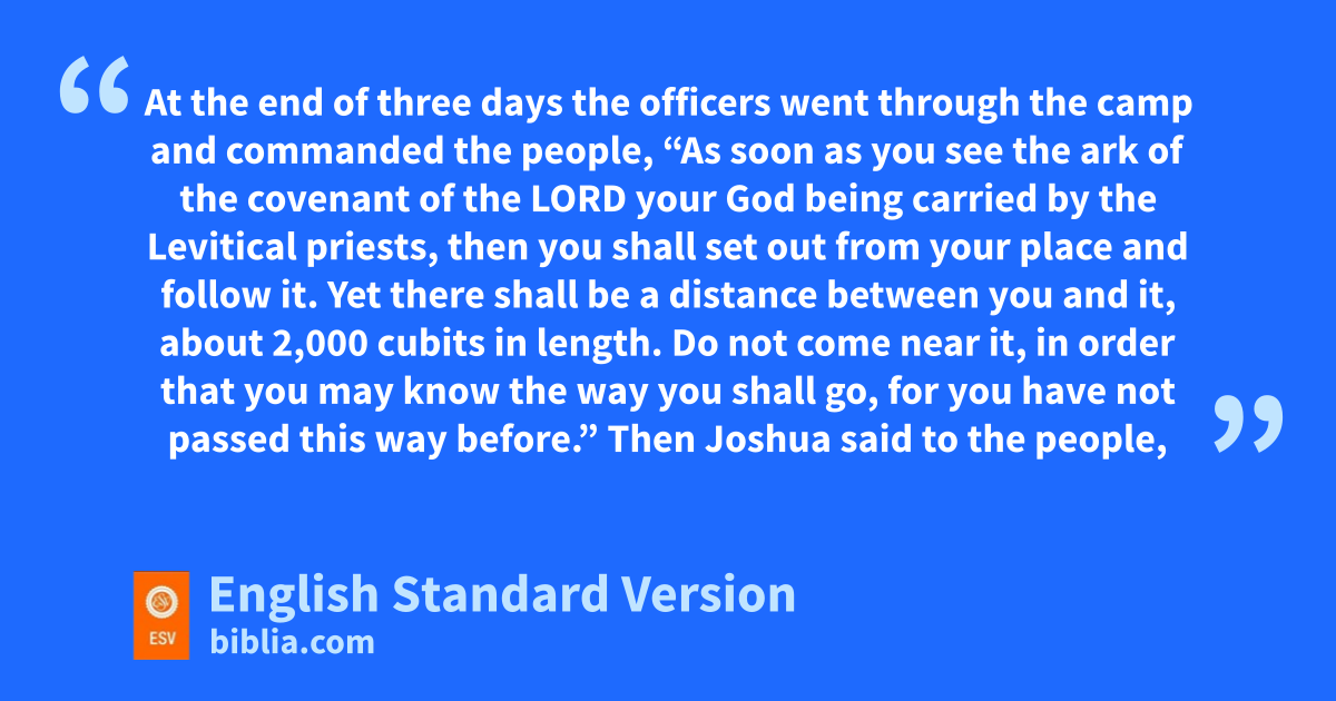 3 Then Joshua rose early in the morning and they set out tfrom Shittim. And they came to the Jordan, he and all the people of Israel, and lodged there before they passed over. 2 uAt the end of three days the officers went through the camp 3 and commanded the people, “As soon as you see the ark of the covenant of the Lord your God being carried by vthe Levitical priests, then you shall set out from your place and follow it. 4 wYet there shall be a distance between you and it, about 2,000 cubits1 in length. Do not come near it, in order that you may know the way you shall go, for you have not passed this way before.” 5 Then Joshua said to the people, x“Consecrate yourselves, for tomorrow the Lord will do wonders among you.” 6 And Joshua said to the priests, y“Take up the ark of the covenant and pass on before the people.” So they took up the ark of the covenant and went before the people.