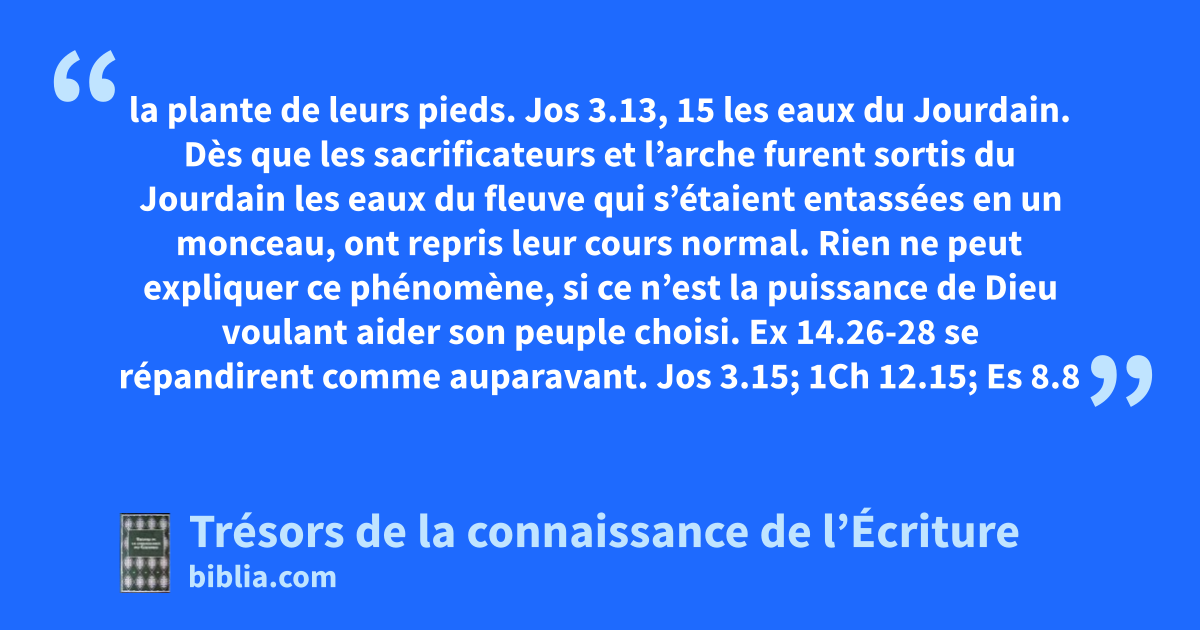 la plante de leurs pieds. Jos 3.13, 15 les eaux du Jourdain. Dès que les sacrificateurs et l’arche furent sortis du Jourdain les eaux du fleuve qui s’étaient entassées en un monceau, ont repris leur cours normal. Rien ne peut expliquer ce phénomène, si ce n’est la puissance de Dieu voulant aider son peuple choisi. Ex 14.26-28 se répandirent comme auparavant. Jos 3.15; 1Ch 12.15; Es 8.8