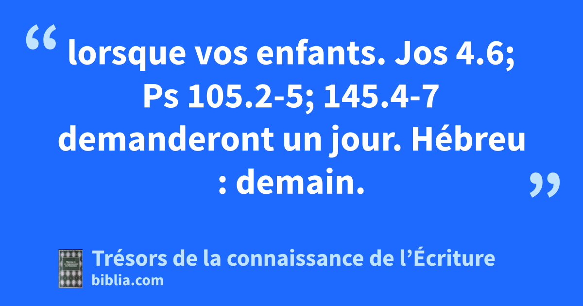 lorsque vos enfants. Jos 4.6; Ps 105.2-5; 145.4-7 demanderont un jour. Hébreu : demain.