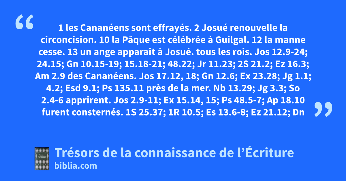 1 les Cananéens sont effrayés. 2 Josué renouvelle la circoncision. 10 la Pâque est célébrée à Guilgal. 12 la manne cesse. 13 un ange apparaît à Josué. tous les rois. Jos 12.9-24; 24.15; Gn 10.15-19; 15.18-21; 48.22; Jr 11.23; 2S 21.2; Ez 16.3; Am 2.9 des Cananéens. Jos 17.12, 18; Gn 12.6; Ex 23.28; Jg 1.1; 4.2; Esd 9.1; Ps 135.11 près de la mer. Nb 13.29; Jg 3.3; So 2.4-6 apprirent. Jos 2.9-11; Ex 15.14, 15; Ps 48.5-7; Ap 18.10 furent consternés. 1S 25.37; 1R 10.5; Es 13.6-8; Ez 21.12; Dn 5.6