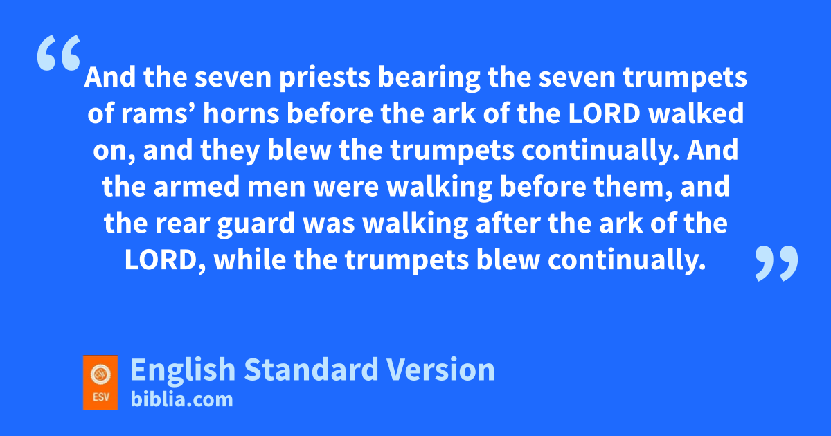 6 Now Jericho was shut up inside and outside because of the people of Israel. None went out, and none came in. 2 And the Lord said to Joshua, “See, gI have given Jericho into your hand, with its king and mighty men of valor. 3 You shall march around the city, all the men of war going around the city once. Thus shall you do for six days. 4 Seven priests shall bear seven htrumpets of irams’ horns before the ark. On the seventh day you shall march around the city seven times, and jthe priests shall blow the trumpets. 5 And when they make a long blast with the ram’s horn, when you hear the sound of the trumpet, then all the people shall shout with a great shout, and the wall of the city will fall down flat,1 and the people shall go up, everyone straight before him.” 6 So Joshua the son of Nun called the priests and said to them, “Take up the ark of the covenant and let seven priests bear seven trumpets of rams’ horns before the ark of the Lord.” 7 And he said to the people, “Go forward. March around the city and let kthe armed men pass on before the ark of the Lord.”