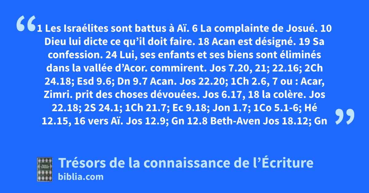 1 Les Israélites sont battus à Aï. 6 La complainte de Josué. 10 Dieu lui dicte ce qu’il doit faire. 18 Acan est désigné. 19 Sa confession. 24 Lui, ses enfants et ses biens sont éliminés dans la vallée d’Acor.