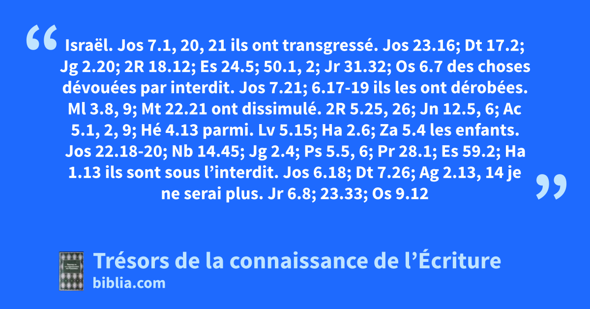 Israël. Jos 7.1, 20, 21 ils ont transgressé. Jos 23.16; Dt 17.2; Jg 2.20; 2R 18.12; Es 24.5; 50.1, 2; Jr 31.32; Os 6.7 des choses dévouées par interdit. Jos 7.21; 6.17-19 ils les ont dérobées. Ml 3.8, 9; Mt 22.21 ont dissimulé. 2R 5.25, 26; Jn 12.5, 6; Ac 5.1, 2, 9; Hé 4.13 parmi. Lv 5.15; Ha 2.6; Za 5.4
