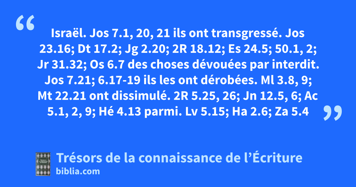 Israël. Jos 7.1, 20, 21 ils ont transgressé. Jos 23.16; Dt 17.2; Jg 2.20; 2R 18.12; Es 24.5; 50.1, 2; Jr 31.32; Os 6.7 des choses dévouées par interdit. Jos 7.21; 6.17-19 ils les ont dérobées. Ml 3.8, 9; Mt 22.21 ont dissimulé. 2R 5.25, 26; Jn 12.5, 6; Ac 5.1, 2, 9; Hé 4.13 parmi. Lv 5.15; Ha 2.6; Za 5.4