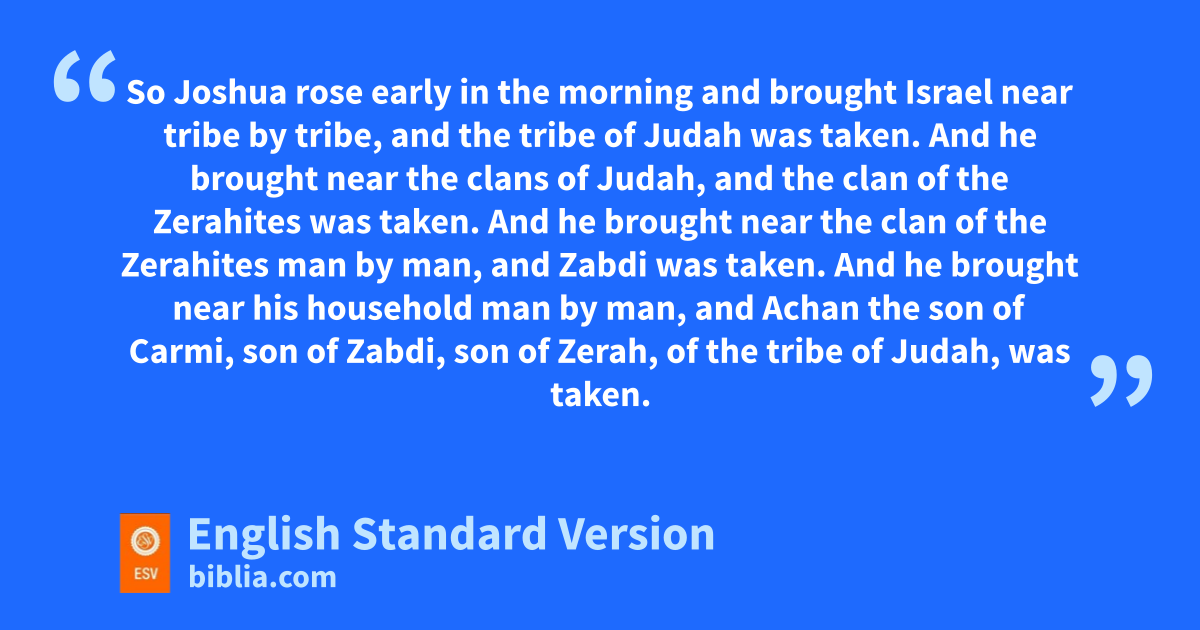 16 So Joshua rose early in the morning and brought Israel near tribe by tribe, and the tribe of Judah was taken. 17 And he brought near the clans of Judah, and the clan of the uZerahites was taken. And he brought near the clan of the Zerahites man by man, and Zabdi was taken. 18 And he brought near his household man by man, and Achan the son of Carmi, son of Zabdi, son of Zerah, of the tribe of Judah, was taken. 19 Then Joshua said to Achan, “My son, vgive glory to the Lord God of Israel and wgive praise2 to him. And xtell me now what you have done; do not hide it from me.” 20 And Achan answered Joshua, “Truly yI have sinned against the Lord God of Israel, and this is what I did: 21 when I saw among the spoil a beautiful cloak from Shinar, and 200 shekels of silver, and a bar of gold weighing 50 shekels,3 then I coveted them and took them. And see, they are hidden in the earth inside my tent, with the silver underneath.”