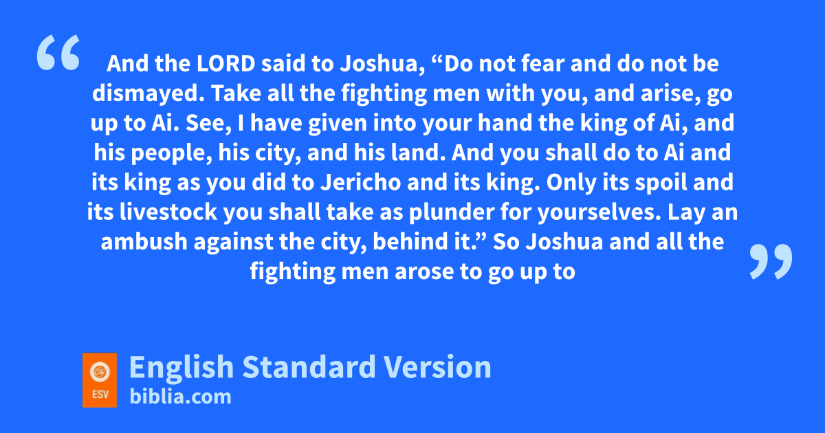 8 And the Lord said to Joshua, f“Do not fear and do not be dismayed. Take all the fighting men with you, and arise, go up to Ai. See, gI have given into your hand the king of Ai, and his people, his city, and his land. 2 And you shall do to Ai and its king as you did hto Jericho and its king. Only iits spoil and its livestock you shall take as plunder for yourselves. Lay an ambush against the city, behind it.”