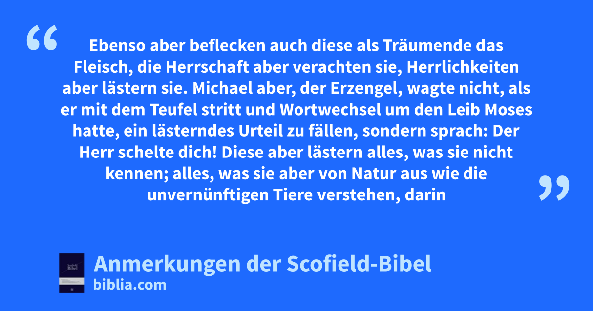 8 Ebenso aber beflecken auch diese als Träumende das Fleischd, die Herrschaft aber verachten sie, Herrlichkeiten aber lästern sie. 9 Michael aber, der Erzengel, wagte nicht, als er mit dem Teufel* stritt und Wortwechsel um den Leib Moses hatte, ein lästerndes Urteilf zu fällen, sondern sprach: Der Herr schelte dichg! 10 Diese aber lästern alles, was sie nicht kennen; alles, was sie aber von Natur aus wie die unvernünftigen Tiere verstehen, darin verderben sie sich. 11 »Wehe ihnen! Denn sie sind den Weg Kains gegangen* und haben sich für Lohn dem Irrtum Bileams völlig hingegeben* , und in dem Widerspruch Korachs sind sie umgekommen* . * 12 Diese sind Flecken bei euren Liebesmahlen, indem sie es sich ohne Furcht mit * euch* gut gehen lassen und sich selbst weiden; Wolken ohne Wasser, von Winden fortgetrieben; spätherbstliche Bäume, fruchtlos, zweimal erstorben, entwurzelt; 13 wilde Meereswogen, die ihre eigenen Schändlichkeiten ausschäumen; Irrsterne, denen das Dunkel der Finsternis in Ewigkeit aufbewahrt ist. 14 Es hat aber auch Henoch, der Siebente von Adam an, von ihnen geweissagt und gesagt* : »Siehe, der Herr ist gekommen mit seinen heiligen Myriaden* , 15 Gericht auszuüben* gegen alle und alle Gottlosen zu überführen von allen ihren Werken der Gottlosigkeit, die sie gottlos verübt haben, und von all den harten * Worten* , die gottlose Sünder* gegen ihn geredet haben.« 16 »Diese sind Murrende, die mit dem Schicksal hadern und nach ihren Begierden wandeln; und ihr Mund redet stolze Worte, und sie bewundern Personen um des Vorteils willen. 17 Ihr aber, Geliebte, gedenkt der von den Aposteln unseres Herrn Jesus Christus vorausgesagten Worte! 18 Denn sie sagten euch, dass am Ende der Zeit Spötter sein werden, die nach ihren gottlosen Begierden wandeln. 19 Diese sind es, die Trennungen verursachen, irdisch gesinnte * Menschen* , die den Geist* nicht haben.