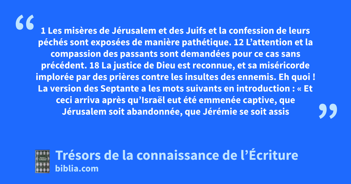 1 Les misères de Jérusalem et des Juifs et la confession de leurs péchés sont exposées de manière pathétique. 12 L’attention et la compassion des passants sont demandées pour ce cas sans précédent. 18 La justice de Dieu est reconnue, et sa miséricorde implorée par des prières contre les insultes des ennemis.