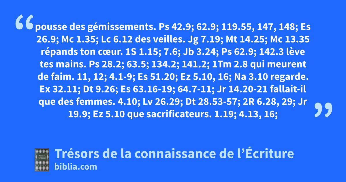 pousse des gémissements. Ps 42.9; 62.9; 119.55, 147, 148; Es 26.9; Mc 1.35; Lc 6.12 des veilles. Jg 7.19; Mt 14.25; Mc 13.35 répands ton cœur. 1S 1.15; 7.6; Jb 3.24; Ps 62.9; 142.3 lève tes mains. Ps 28.2; 63.5; 134.2; 141.2; 1Tm 2.8 qui meurent de faim. 11, 12; 4.1-9; Es 51.20; Ez 5.10, 16; Na 3.10