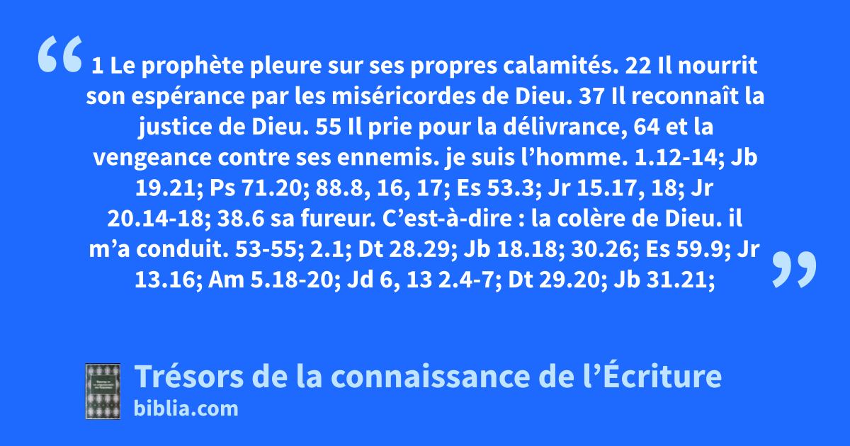 1 Le prophète pleure sur ses propres calamités. 22 Il nourrit son espérance par les miséricordes de Dieu. 37 Il reconnaît la justice de Dieu. 55 Il prie pour la délivrance, 64 et la vengeance contre ses ennemis.