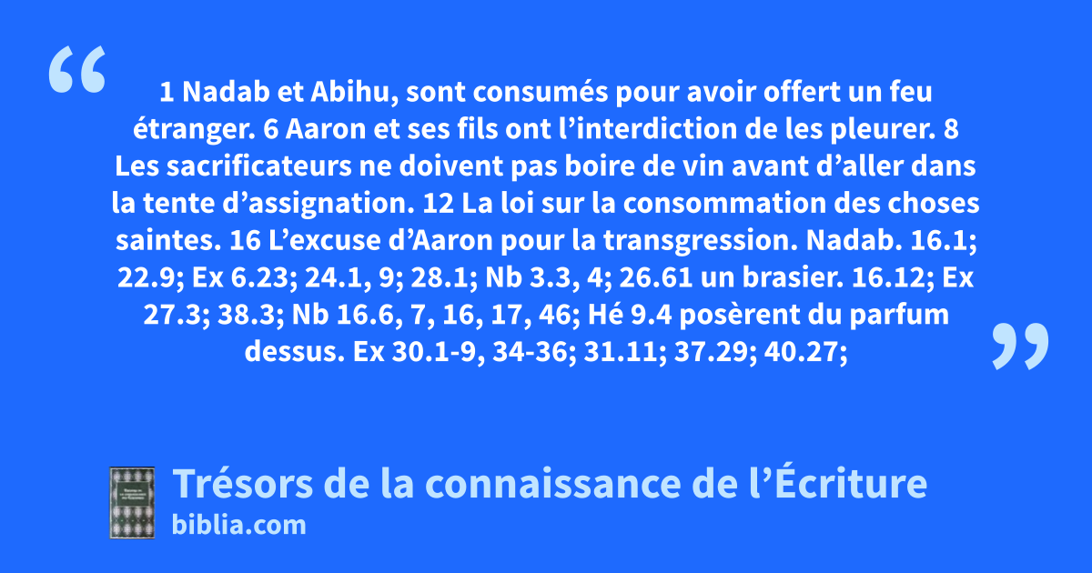 Nadab. 16.1; 22.9; Ex 6.23; 24.1, 9; 28.1; Nb 3.3, 4; 26.61 un brasier. 16.12; Ex 27.3; 38.3; Nb 16.6, 7, 16, 17, 46; Hé 9.4 posèrent du parfum dessus. Ex 30.1-9, 34-36; 31.11; 37.29; 40.27; 1R 13.1, 2; 2Ch 26.16-20; Ps 141.2; Jr 44.8, 15, 19-21; Lc 1.9-11; Ap 8.3-5 du feu étranger. 9.24; 16.12; Nb 16.18, 46 ce qu’il ne leur avait point ordonné. Ex 30.9; Dt 4.2; 12.32; 17.3; Jr 7.31; 19.5; 32.35 Il est dangereux, dans le service de Dieu, d’en modifier les institutions ; nous devons faire ce qui est sage, ce qu’il a prescrit, et éviter avec fermeté ce qu’il n’a pas prescrit.