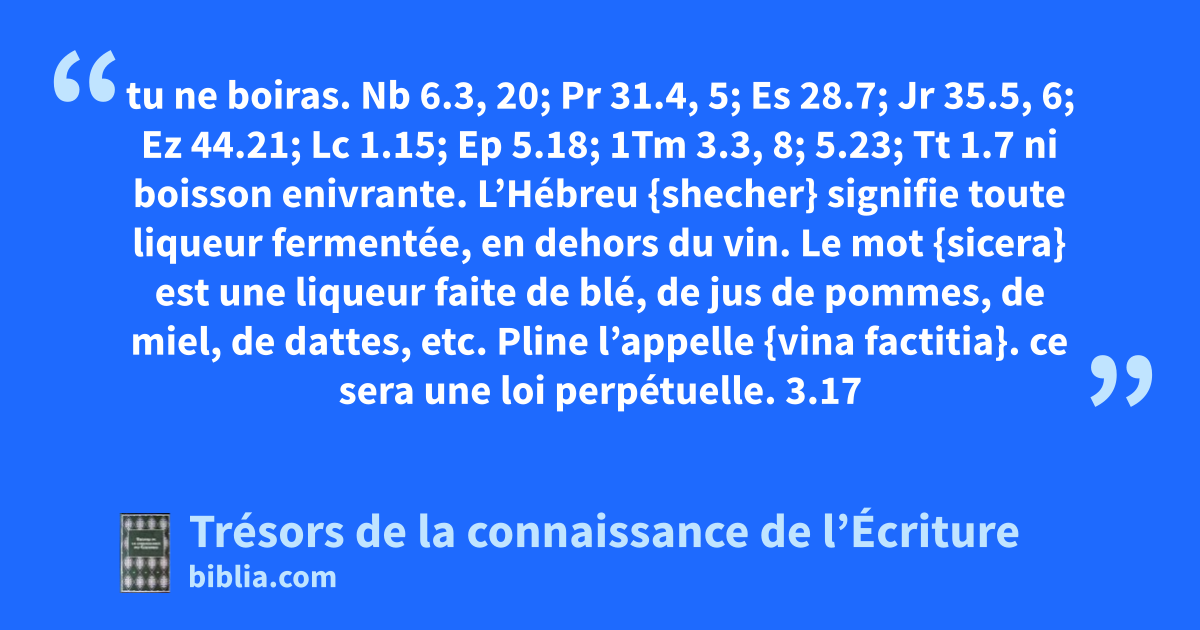 tu ne boiras. Nb 6.3, 20; Pr 31.4, 5; Es 28.7; Jr 35.5, 6; Ez 44.21; Lc 1.15; Ep 5.18; 1Tm 3.3, 8; 5.23; Tt 1.7 ni boisson enivrante. L’Hébreu {shecher} signifie toute liqueur fermentée, en dehors du vin. Le mot {sicera} est une liqueur faite de blé, de jus de pommes, de miel, de dattes, etc. Pline l’appelle {vina factitia}. ce sera une loi perpétuelle. 3.17