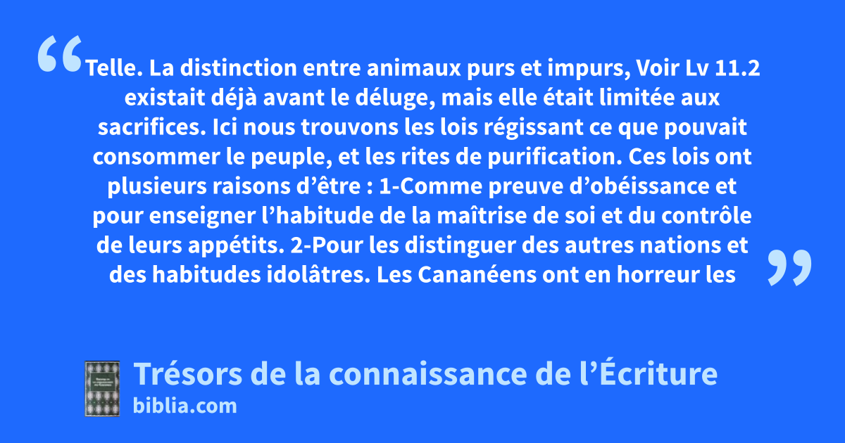 Telle. La distinction entre animaux purs et impurs, Voir Lv 11.2 existait déjà avant le déluge, mais elle était limitée aux sacrifices. Ici nous trouvons les lois régissant ce que pouvait consommer le peuple, et les rites de purification. Ces lois ont plusieurs raisons d’être : 1-Comme preuve d’obéissance et pour enseigner l’habitude de la maîtrise de soi et du contrôle de leurs appétits. 2-Pour les distinguer des autres nations et des habitudes idolâtres. Les Cananéens ont en horreur les animaux prohibés par Moïse, que nous consommons généralement, mais aussi d’autres animaux, comme le chien. Beaucoup de ces animaux déclarés impurs étaient considérés comme sacrés parmi les païens, et sacrifiés à leurs dieux. 3-Parce que beaucoup de ces animaux n’ont aucune valeur nutritive ou sont nocifs dans certaines conditions, comme le cochon, surtout sous ces climats chauds, ou il amène de nombreuses maladies. 7.37; 14.54; 15.32; Ez 43.12
