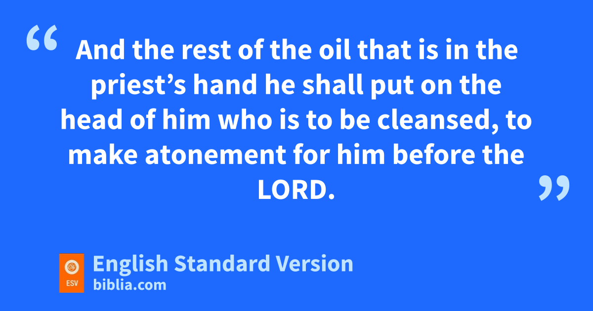 21 “But nif he is poor and cannot afford so much, then he shall take one male lamb for a guilt offering hto be waved, to make atonement for him, and a tenth of an ephah of fine flour mixed with oil for a grain offering, and a log of oil; 22 oalso two turtledoves or two pigeons, whichever he can afford. The one shall be a sin offering and the other a burnt offering. 23 pAnd on the eighth day he shall bring them for his cleansing to the priest, to the entrance of the tent of meeting, before the Lord. 24 qAnd the priest shall take the lamb of the guilt offering and the log of oil, and the priest shall wave them for a wave offering before the Lord. 25 And he shall kill the lamb of the guilt offering. rAnd the priest shall take some of the blood of the guilt offering and put it on the lobe of the right ear of him who is to be cleansed, and on the thumb of his right hand and on the big toe of his right foot. 26 And the priest shall pour some of the oil into the palm of his own left hand, 27 and shall sprinkle with his right finger some of the oil that is in his left hand seven times before the Lord. 28 And the priest shall put some of the oil that is in his hand on the lobe of the right ear of him who is to be cleansed and on the thumb of his right hand and on the big toe of his right foot, in the place where the blood of the guilt offering was put. 29 And the rest of the oil that is in the priest’s hand he shall put on the head of him who is to be cleansed, to make atonement for him before the Lord. 30 And he shall offer, of the sturtledoves or pigeons, whichever he can afford, 31 one5 for a sin offering and the other for a burnt offering, along with a grain offering. mAnd the priest shall make atonement before the Lord for him who is being cleansed. 32 This is the law for him in whom is a case of leprous disease, who cannot afford tthe offerings for his cleansing.”