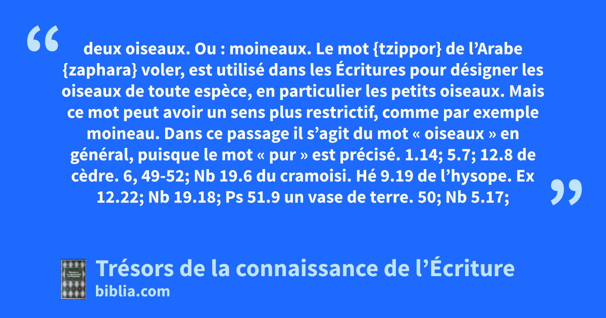 deux oiseaux. Ou : moineaux. Le mot {tzippor} de l’Arabe {zaphara} voler, est utilisé dans les Écritures pour désigner les oiseaux de toute espèce, en particulier les petits oiseaux. Mais ce mot peut avoir un sens plus restrictif, comme par exemple moineau. Dans ce passage il s’agit du mot « oiseaux » en général, puisque le mot « pur » est précisé. 1.14; 5.7; 12.8 de cèdre. 6, 49-52; Nb 19.6 du cramoisi. Hé 9.19 de l’hysope. Ex 12.22; Nb 19.18; Ps 51.9