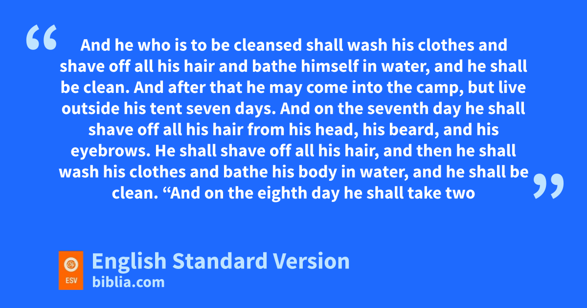 14 The Lord spoke to Moses, saying, 2 “This shall be the law of the leprous person for the day of his cleansing. sHe shall be brought to the priest, 3 and the priest shall go tout of the camp, and the priest shall look. Then, if the case of leprous disease is healed in the leprous person, 4 the priest shall command them to take for him who is to be cleansed two live1 clean birds and ucedarwood and vscarlet yarn and whyssop. 5 And the priest shall command them to kill one of the birds in an earthenware vessel over fresh2 water. 6 He shall take the live bird with the cedarwood and the scarlet yarn and the hyssop, and dip them and the live bird in the blood of the bird that was killed over the fresh water. 7 And he shall xsprinkle it yseven times on him who is to be cleansed of the leprous disease. Then he shall pronounce him clean and shall zlet the living bird go ainto the open field. 8 And he who is to be cleansed bshall wash his clothes and shave off all his hair and bathe himself in water, and he shall be clean. And after that he may come into the camp, but clive outside his tent seven days. 9 And don the seventh day he shall shave off all his hair from his head, his beard, and his eyebrows. He shall shave off all his hair, and then he bshall wash his clothes and bathe his body in water, and he shall be clean.