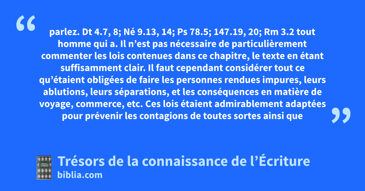 parlez. Dt 4.7, 8; Né 9.13, 14; Ps 78.5; 147.19, 20; Rm 3.2 tout homme qui a. Il n’est pas nécessaire de particulièrement commenter les lois contenues dans ce chapitre, le texte en étant suffisamment clair. Il faut cependant considérer tout ce qu’étaient obligées de faire les personnes rendues impures, leurs ablutions, leurs séparations, et les conséquences en matière de voyage, commerce, etc. Ces lois étaient admirablement adaptées pour prévenir les contagions de toutes sortes ainsi que tout excès. 22.4; Nb 5.2; 2S 3.29; Mt 9.20; Mc 5.25; 7.20-23; Lc 8.43