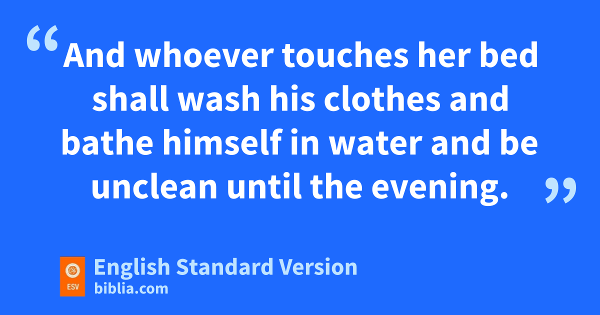 19 “When a woman has a discharge, and the discharge in her body is blood, she shall be in her menstrual impurity for seven days, and whoever touches her shall be unclean until the evening. 20 rAnd everything on which she lies during her menstrual impurity shall be unclean. Everything also on which she sits shall be unclean. 21 And whoever touches her bed shall wash his clothes and bathe himself in water and be unclean until the evening. 22 And whoever touches anything on which she sits shall wash his clothes and bathe himself in water and be unclean until the evening. 23 Whether it is the bed or anything on which she sits, when he touches it he shall be unclean until the evening. 24 And sif any man lies with her and her menstrual impurity comes upon him, he shall be unclean seven days, and every bed on which he lies shall be unclean.