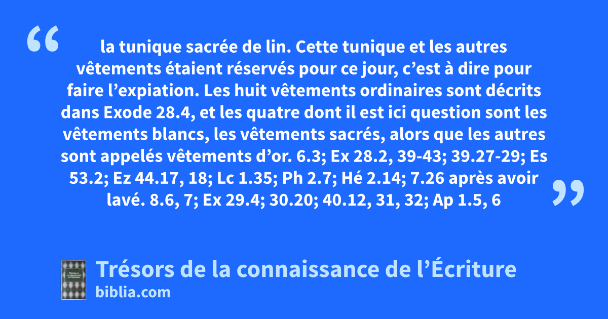 la tunique sacrée de lin. Cette tunique et les autres vêtements étaient réservés pour ce jour, c’est à dire pour faire l’expiation. Les huit vêtements ordinaires sont décrits dans Exode 28.4, et les quatre dont il est ici question sont les vêtements blancs, les vêtements sacrés, alors que les autres sont appelés vêtements d’or. 6.3; Ex 28.2, 39-43; 39.27-29; Es 53.2; Ez 44.17, 18; Lc 1.35; Ph 2.7; Hé 2.14; 7.26 après avoir lavé. 8.6, 7; Ex 29.4; 30.20; 40.12, 31, 32; Ap 1.5, 6