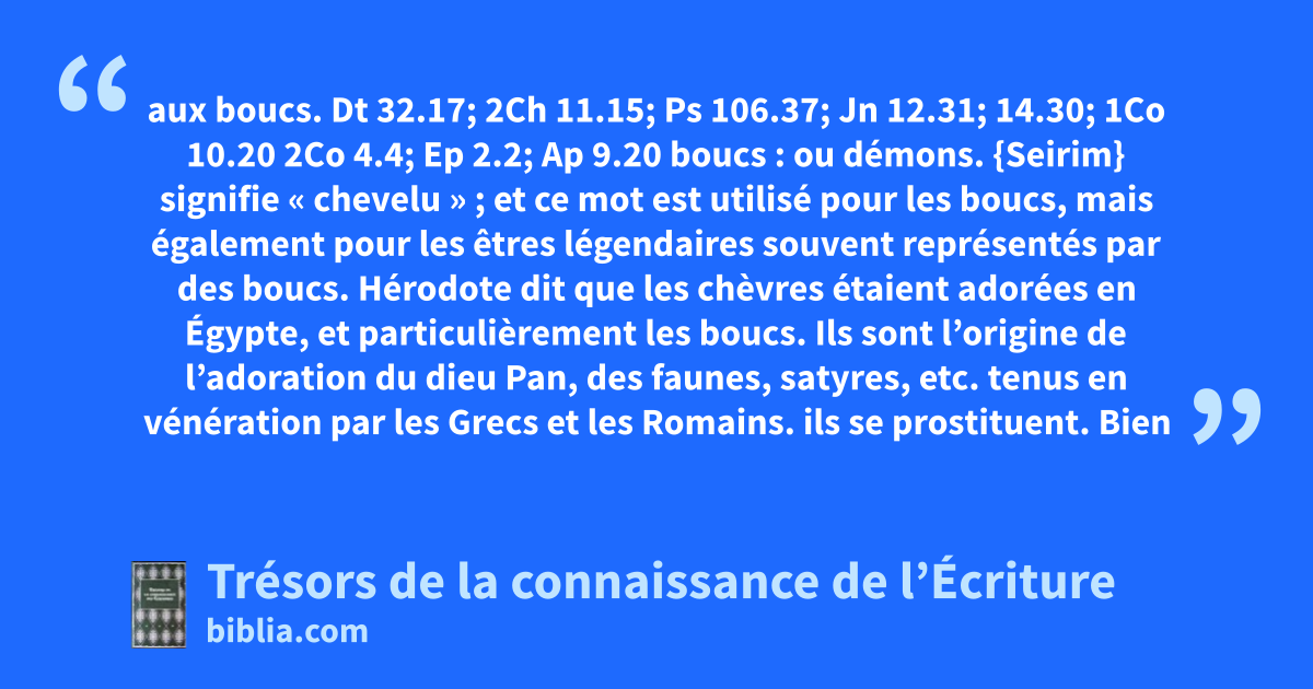 aux boucs. Dt 32.17; 2Ch 11.15; Ps 106.37; Jn 12.31; 14.30; 1Co 10.20 2Co 4.4; Ep 2.2; Ap 9.20 boucs : ou démons. {Seirim} signifie « chevelu » ; et ce mot est utilisé pour les boucs, mais également pour les êtres légendaires souvent représentés par des boucs. Hérodote dit que les chèvres étaient adorées en Égypte, et particulièrement les boucs. Ils sont l’origine de l’adoration du dieu Pan, des faunes, satyres, etc. tenus en vénération par les Grecs et les Romains. ils se prostituent. Bien que cette phrase soit équivalente, dans l’Écriture, à pratiquer l’idolâtrie, elle peut aussi être prise dans un sens littéral. Baal-Peor et Aschtaroth étaient adorés avec des rites obscènes, et la prostitution publique constituait une grande partie de l’adoration parmi les Égyptiens, les Moabites, les Cananéens, Grecs, et Romains. 20.5; Ex 34.15; Dt 31.16; Jr 3.1; Ez 23.8; Ap 17.1-5