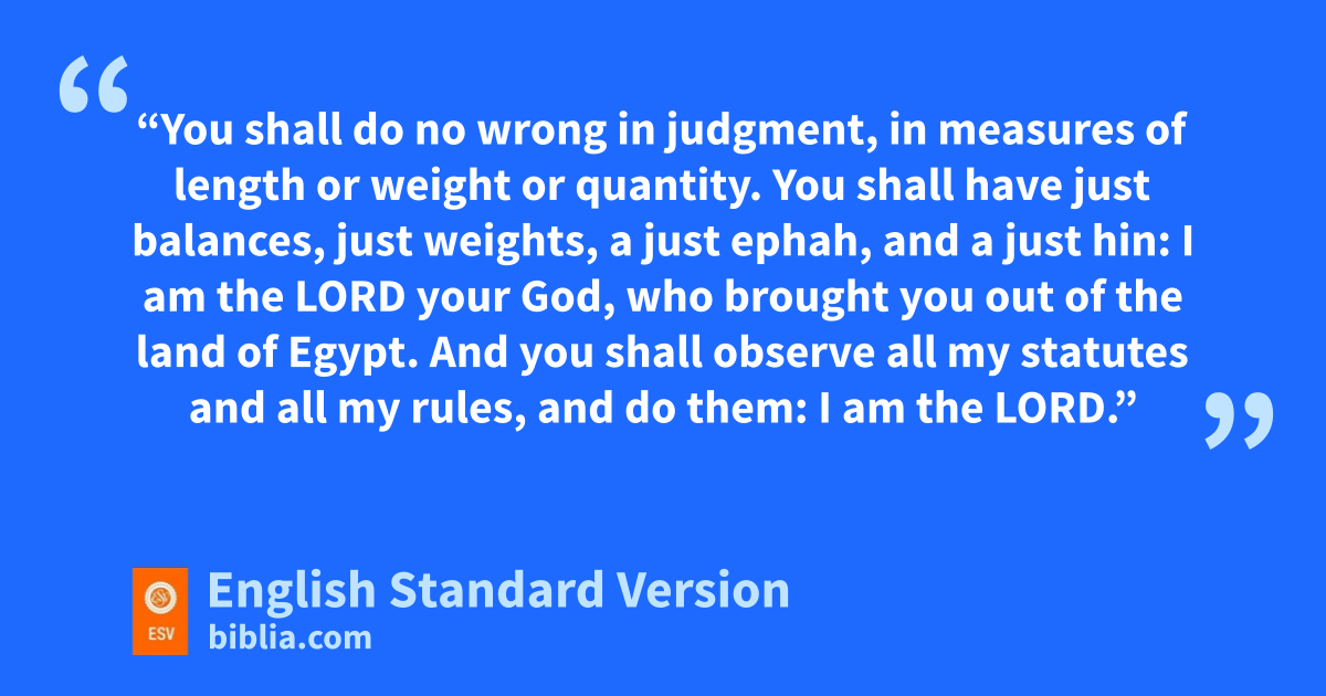 35 l“You shall do no wrong in judgment, in measures of length or weight or quantity. 36 mYou shall have just balances, just weights, a just ephah, and a just hin:3 I am the Lord your God, who brought you out of the land of Egypt. 37 And nyou shall observe all my statutes and all my rules, and do them: I am the Lord.”