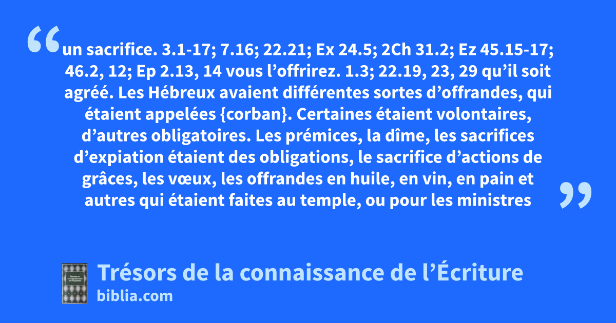 un sacrifice. 3.1-17; 7.16; 22.21; Ex 24.5; 2Ch 31.2; Ez 45.15-17; 46.2, 12; Ep 2.13, 14 vous l’offrirez. 1.3; 22.19, 23, 29 qu’il soit agréé. Les Hébreux avaient différentes sortes d’offrandes, qui étaient appelées {corban}. Certaines étaient volontaires, d’autres obligatoires. Les prémices, la dîme, les sacrifices d’expiation étaient des obligations, le sacrifice d’actions de grâces, les vœux, les offrandes en huile, en vin, en pain et autres qui étaient faites au temple, ou pour les ministres de Dieu étaient des offrandes de dévotion, et constituaient la part essentielle. Elles étaient l’ombre des bonnes choses à venir. « Aaron doit rejeter au loin ses robes, Sa tiare et sa tunique, Quand Dieu lui-même descend pour être L’offrande et le sacrificateur. »