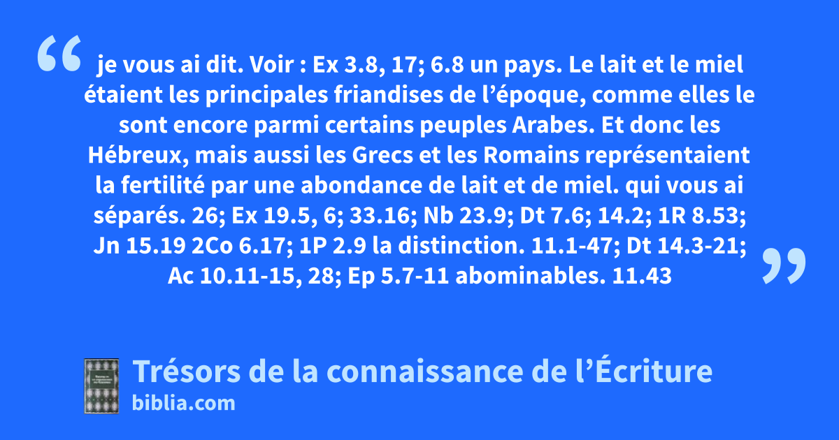 je vous ai dit. Voir : Ex 3.8, 17; 6.8 un pays. Le lait et le miel étaient les principales friandises de l’époque, comme elles le sont encore parmi certains peuples Arabes. Et donc les Hébreux, mais aussi les Grecs et les Romains représentaient la fertilité par une abondance de lait et de miel. qui vous ai séparés. 26; Ex 19.5, 6; 33.16; Nb 23.9; Dt 7.6; 14.2; 1R 8.53; Jn 15.19 2Co 6.17; 1P 2.9