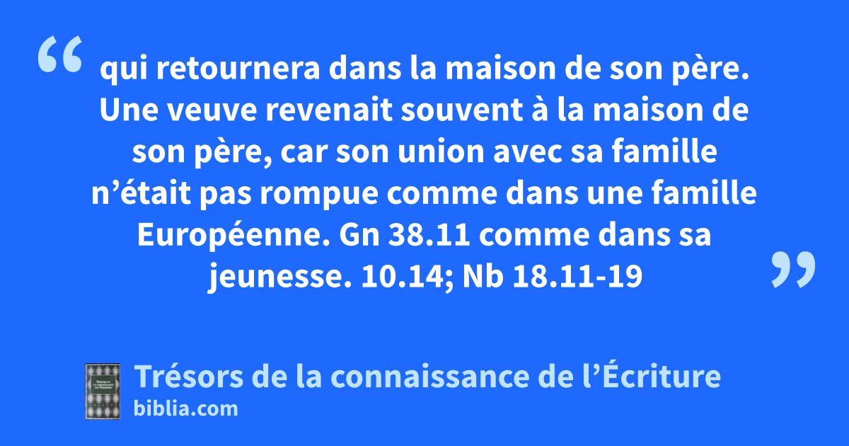 qui retournera dans la maison de son père. Une veuve revenait souvent à la maison de son père, car son union avec sa famille n’était pas rompue comme dans une famille Européenne. Gn 38.11 comme dans sa jeunesse. 10.14; Nb 18.11-19