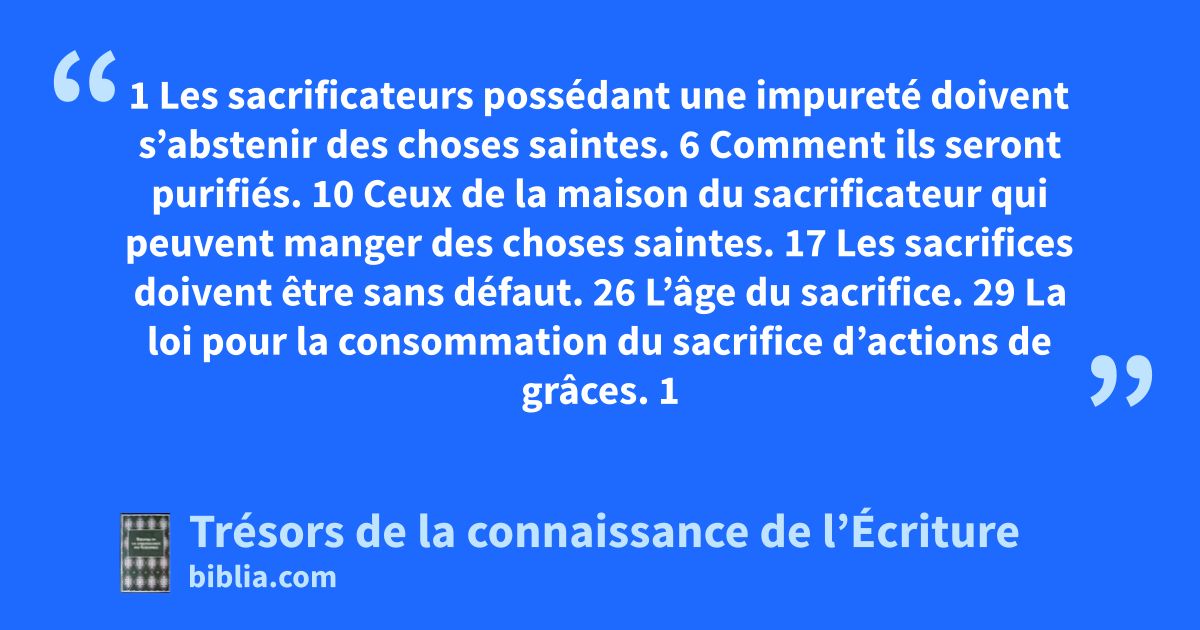 1 Les sacrificateurs possédant une impureté doivent s’abstenir des choses saintes. 6 Comment ils seront purifiés. 10 Ceux de la maison du sacrificateur qui peuvent manger des choses saintes. 17 Les sacrifices doivent être sans défaut. 26 L’âge du sacrifice. 29 La loi pour la consommation du sacrifice d’actions de grâces.