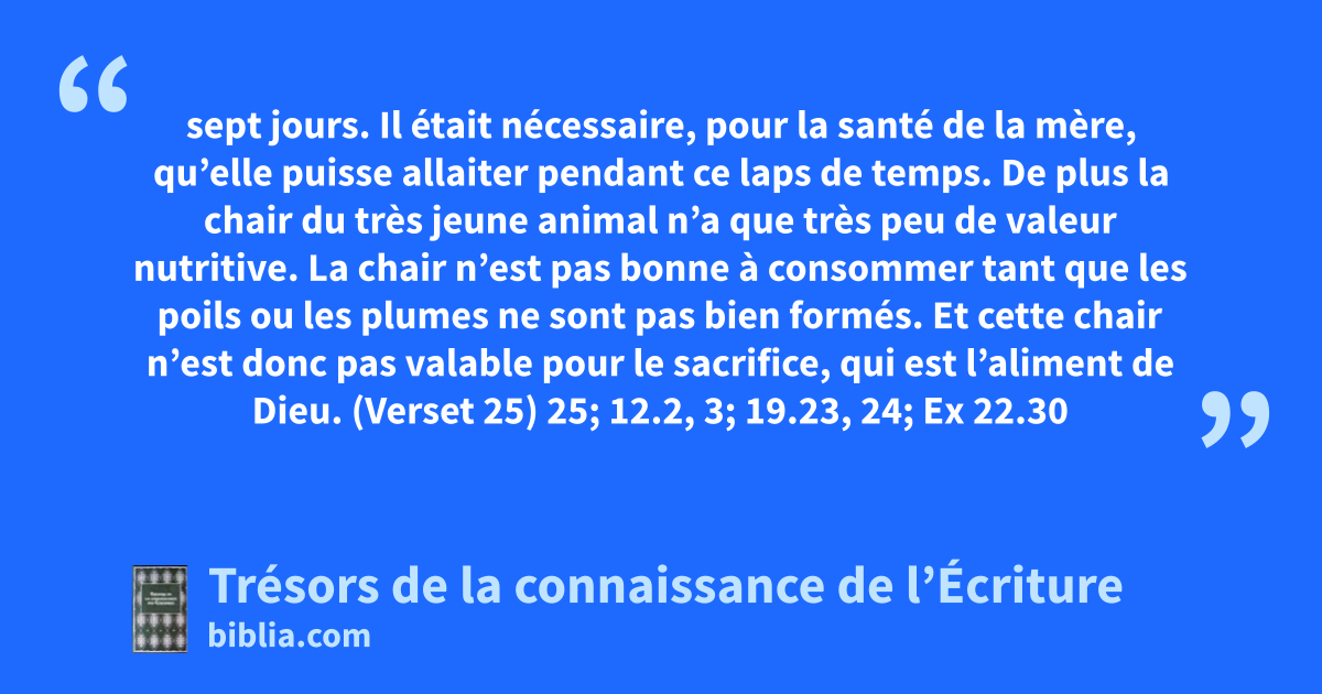 sept jours. Il était nécessaire, pour la santé de la mère, qu’elle puisse allaiter pendant ce laps de temps. De plus la chair du très jeune animal n’a que très peu de valeur nutritive. La chair n’est pas bonne à consommer tant que les poils ou les plumes ne sont pas bien formés. Et cette chair n’est donc pas valable pour le sacrifice, qui est l’aliment de Dieu. (Verset 25) 25; 12.2, 3; 19.23, 24; Ex 22.30