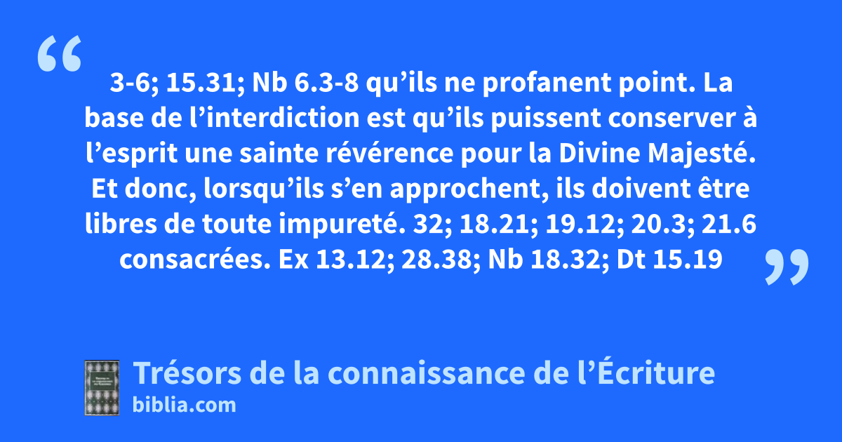 3-6; 15.31; Nb 6.3-8 qu’ils ne profanent point. La base de l’interdiction est qu’ils puissent conserver à l’esprit une sainte révérence pour la Divine Majesté. Et donc, lorsqu’ils s’en approchent, ils doivent être libres de toute impureté. 32; 18.21; 19.12; 20.3; 21.6 consacrées. Ex 13.12; 28.38; Nb 18.32; Dt 15.19