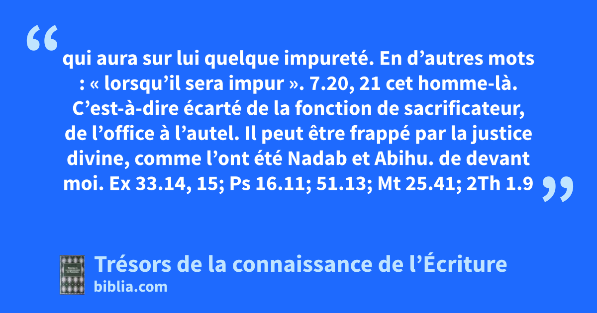 qui aura sur lui quelque impureté. En d’autres mots : « lorsqu’il sera impur ». 7.20, 21 cet homme-là. C’est-à-dire écarté de la fonction de sacrificateur, de l’office à l’autel. Il peut être frappé par la justice divine, comme l’ont été Nadab et Abihu. de devant moi. Ex 33.14, 15; Ps 16.11; 51.13; Mt 25.41; 2Th 1.9