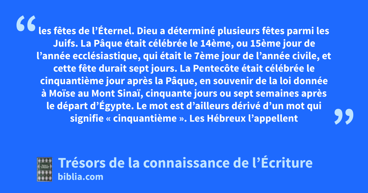 les fêtes de l’Éternel. Dieu a déterminé plusieurs fêtes parmi les Juifs. La Pâque était célébrée le 14ème, ou 15ème jour de l’année ecclésiastique, qui était le 7ème jour de l’année civile, et cette fête durait sept jours. La Pentecôte était célébrée le cinquantième jour après la Pâque, en souvenir de la loi donnée à Moïse au Mont Sinaï, cinquante jours ou sept semaines après le départ d’Égypte. Le mot est d’ailleurs dérivé d’un mot qui signifie « cinquantième ». Les Hébreux l’appellent la fête des semaines. Ex 34.22 La fête des trompettes est célébrée le premier jour de l’année civile, lorsqu’une trompette a sonné pour annoncer la nouvelle année, au mois de {Tisri} correspondant à septembre pour nous. Les nouvelles lunes, ou premier jour de chaque mois, étaient en quelque sorte une conséquence de la fête des trompettes. En demandant chaque mois les premiers fruits, Dieu rappelait qu’il était l’Éternel de tous leurs instants. La fête de l’expiation était observée le 18ème jour de {Tisri} ou Septembre : les Hébreux l’appellent « Kippur » c’est-à-dire pardon ou expiation, parce qu’elle est instituée pour l’expiation de leurs péchés. La fête des tabernacles est ainsi appelée parce que les Israélites la célébraient sous des tentes ou des branchages, en souvenir de leur demeures pendant leur séjour dans le désert. Elle était célébrée le 15ème jour de {Tisri} et durait huit jours. A côté de ces fêtes, nous trouvons la fête des {lots} ou {Purim} célébrée le 14 du mois {Adar} qui correspond à février. La fête de la dédicace du temple, ou plutôt celle de la restauration du temple, qui avait été profané par Antioche Epiphane, que l’on suppose être la fête mentionnée dans l’Évangile de Jean : Jn 10.22 et qui était célébrée en hiver. 4, 37; Ex 23.14-17; Es 1.13, 14; 33.20; Lm 1.4; Os 2.13; Na 2.1; Jn 5.1; Col 2.1 que vous publierez. Ex 32.5; Nb 10.2, 3, 10; 2R 10.20; 2Ch 30.5; Ps 81.4; Jl 1.14; 2.15; Jon 3.5-9