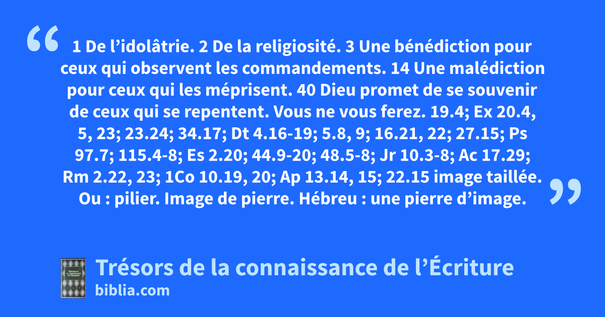 Vous ne vous ferez. 19.4; Ex 20.4, 5, 23; 23.24; 34.17; Dt 4.16-19; 5.8, 9; 16.21, 22; 27.15; Ps 97.7; 115.4-8; Es 2.20; 44.9-20; 48.5-8; Jr 10.3-8; Ac 17.29; Rm 2.22, 23; 1Co 10.19, 20; Ap 13.14, 15; 22.15 image taillée. Ou : pilier. Image de pierre. Hébreu : une pierre d’image.