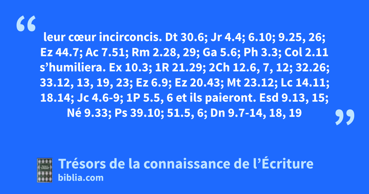 leur cœur incirconcis. Dt 30.6; Jr 4.4; 6.10; 9.25, 26; Ez 44.7; Ac 7.51; Rm 2.28, 29; Ga 5.6; Ph 3.3; Col 2.11 s’humiliera. Ex 10.3; 1R 21.29; 2Ch 12.6, 7, 12; 32.26; 33.12, 13, 19, 23; Ez 6.9; Ez 20.43; Mt 23.12; Lc 14.11; 18.14; Jc 4.6-9; 1P 5.5, 6 et ils paieront. Esd 9.13, 15; Né 9.33; Ps 39.10; 51.5, 6; Dn 9.7-14, 18, 19