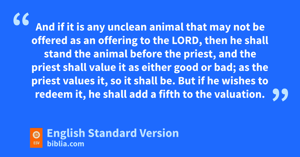 9 “If the vow2 is an animal that may be offered as an offering to the Lord, all of it that he gives to the Lord is holy. 10 qHe shall not exchange it or make a substitute for it, good for bad, or bad for good; and if he does in fact substitute one animal for another, then both it and the substitute shall be holy. 11 And if it is any unclean animal that may not be offered as an offering to the Lord, then he shall stand the animal before the priest, 12 and the priest shall value it as either good or bad; as the priest values it, so it shall be. 13 rBut if he wishes to redeem it, he shall add a sfifth to the valuation.
