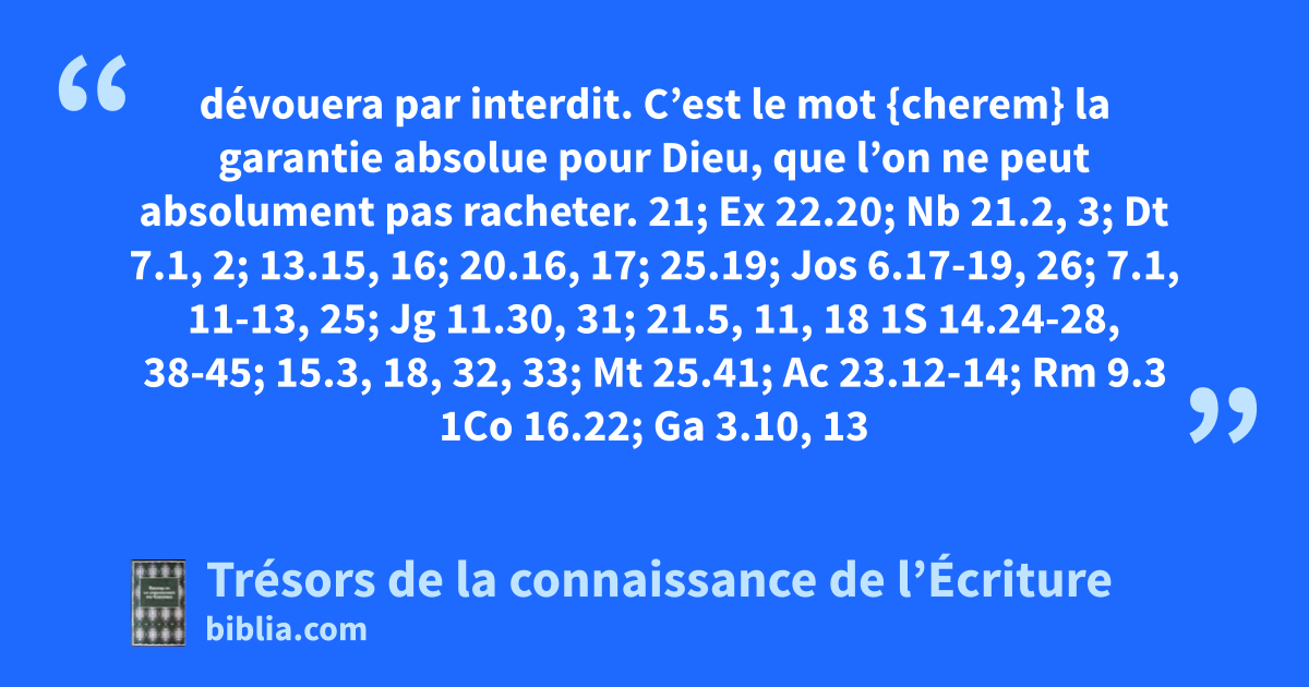 dévouera par interdit. C’est le mot {cherem} la garantie absolue pour Dieu, que l’on ne peut absolument pas racheter. 21; Ex 22.20; Nb 21.2, 3; Dt 7.1, 2; 13.15, 16; 20.16, 17; 25.19; Jos 6.17-19, 26; 7.1, 11-13, 25; Jg 11.30, 31; 21.5, 11, 18 1S 14.24-28, 38-45; 15.3, 18, 32, 33; Mt 25.41; Ac 23.12-14; Rm 9.3 1Co 16.22; Ga 3.10, 13