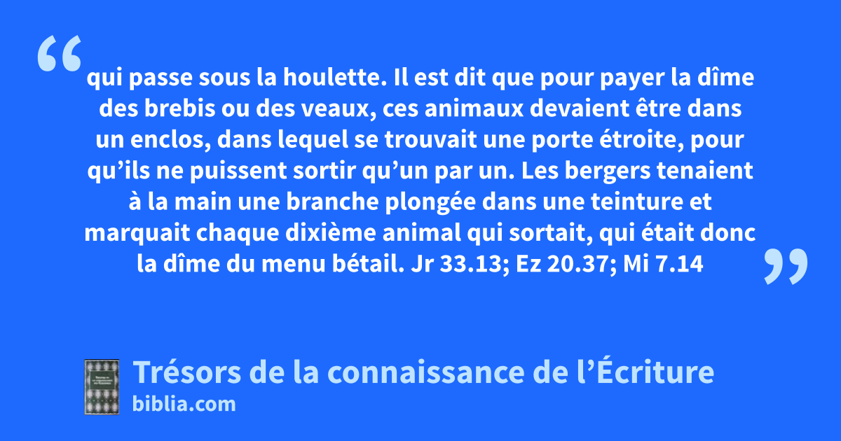 qui passe sous la houlette. Il est dit que pour payer la dîme des brebis ou des veaux, ces animaux devaient être dans un enclos, dans lequel se trouvait une porte étroite, pour qu’ils ne puissent sortir qu’un par un. Les bergers tenaient à la main une branche plongée dans une teinture et marquait chaque dixième animal qui sortait, qui était donc la dîme du menu bétail. Jr 33.13; Ez 20.37; Mi 7.14