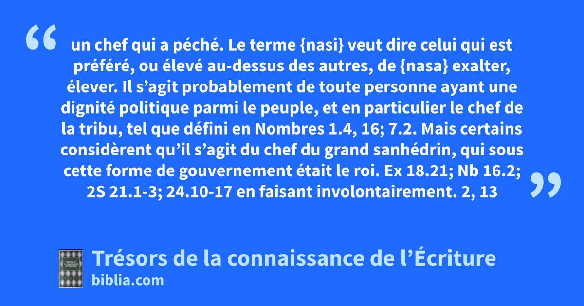 un chef qui a péché. Le terme {nasi} veut dire celui qui est préféré, ou élevé au-dessus des autres, de {nasa} exalter, élever. Il s’agit probablement de toute personne ayant une dignité politique parmi le peuple, et en particulier le chef de la tribu, tel que défini en Nombres 1.4, 16; 7.2. Mais certains considèrent qu’il s’agit du chef du grand sanhédrin, qui sous cette forme de gouvernement était le roi. Ex 18.21; Nb 16.2; 2S 21.1-3; 24.10-17 en faisant involontairement. 2, 13