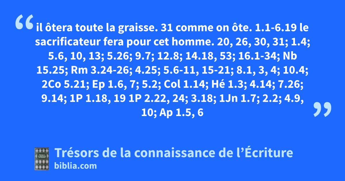 il ôtera toute la graisse. 31 comme on ôte. 1.1-6.19 le sacrificateur fera pour cet homme. 20, 26, 30, 31; 1.4; 5.6, 10, 13; 5.26; 9.7; 12.8; 14.18, 53; 16.1-34; Nb 15.25; Rm 3.24-26; 4.25; 5.6-11, 15-21; 8.1, 3, 4; 10.4; 2Co 5.21; Ep 1.6, 7; 5.2; Col 1.14; Hé 1.3; 4.14; 7.26; 9.14; 1P 1.18, 19 1P 2.22, 24; 3.18; 1Jn 1.7; 2.2; 4.9, 10; Ap 1.5, 6