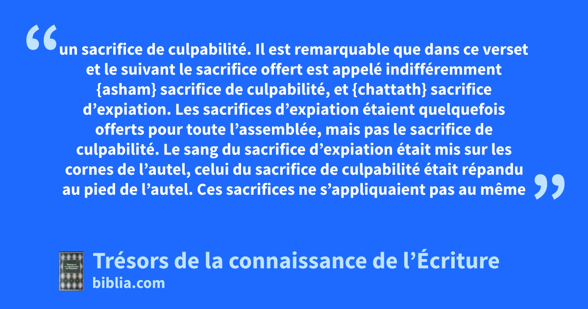 un sacrifice de culpabilité. Il est remarquable que dans ce verset et le suivant le sacrifice offert est appelé indifféremment {asham} sacrifice de culpabilité, et {chattath} sacrifice d’expiation. Les sacrifices d’expiation étaient quelquefois offerts pour toute l’assemblée, mais pas le sacrifice de culpabilité. Le sang du sacrifice d’expiation était mis sur les cornes de l’autel, celui du sacrifice de culpabilité était répandu au pied de l’autel. Ces sacrifices ne s’appliquaient pas au même genre de fautes. 4.28, 32; 5.25; 7.1-7; 14.12, 13; 19.21, 22; Nb 6.12; Ez 40.39; 42.13 une femelle. 4.28, 32 le sacrificateur. 4.20