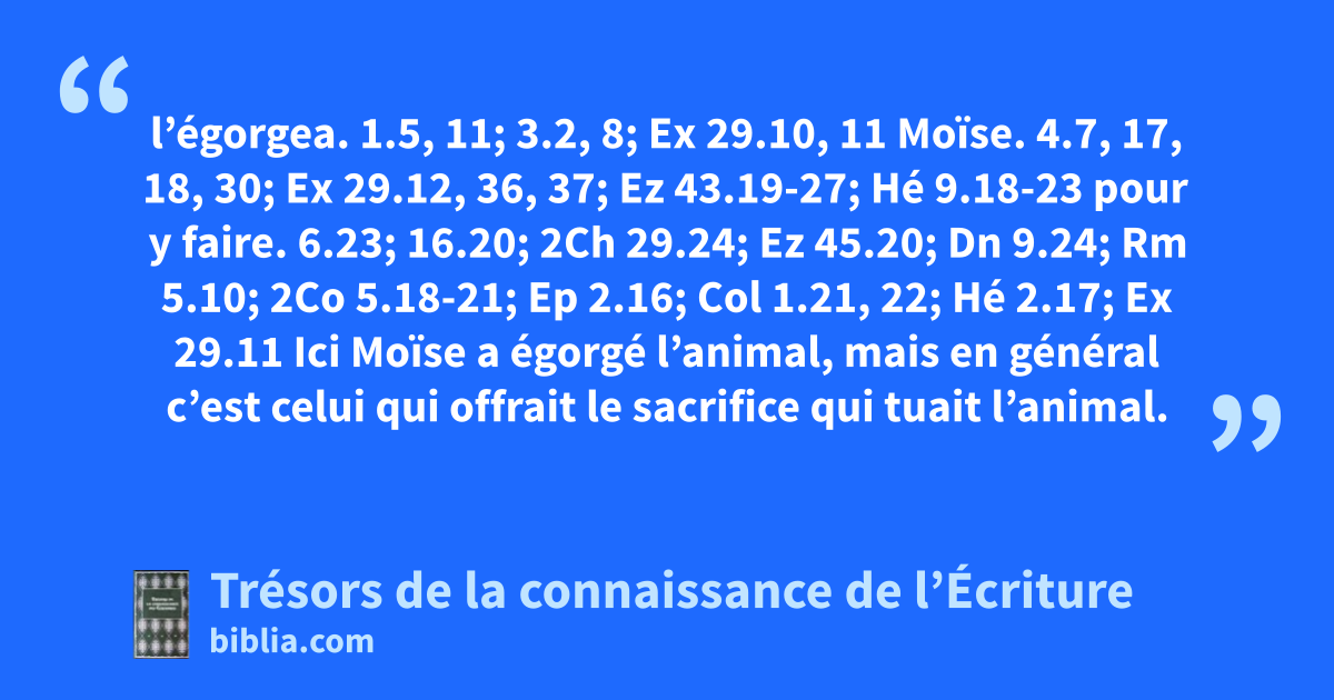 l’égorgea. 1.5, 11; 3.2, 8; Ex 29.10, 11 Moïse. 4.7, 17, 18, 30; Ex 29.12, 36, 37; Ez 43.19-27; Hé 9.18-23 pour y faire. 6.23; 16.20; 2Ch 29.24; Ez 45.20; Dn 9.24; Rm 5.10; 2Co 5.18-21; Ep 2.16; Col 1.21, 22; Hé 2.17; Ex 29.11 Ici Moïse a égorgé l’animal, mais en général c’est celui qui offrait le sacrifice qui tuait l’animal.