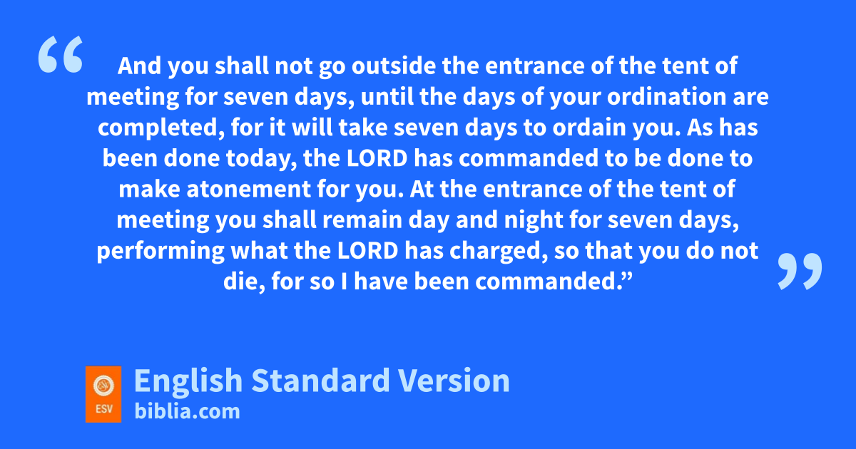 31 And Moses said to Aaron and his sons, “Boil the flesh at the entrance of the tent of meeting, and there eat it and the bread that is in the basket of ordination offerings, as I commanded, saying, ‘Aaron and his sons shall eat it.’ 32 And what remains of the flesh and the bread you shall burn up with fire. 33 And you shall not go outside the entrance of the tent of meeting for seven days, until the days of your ordination are completed, for it pwill take seven days to ordain you. 34 As has been done today, the Lord has commanded to be done to make atonement for you. 35 At the entrance of the tent of meeting you shall remain day and night for seven days, performing what the Lord has qcharged, so that you do not die, for so I have been commanded.” 36 And Aaron and his sons did all the things that the Lord commanded by Moses.