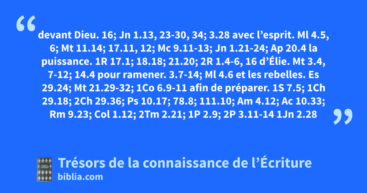 devant Dieu. 16; Jn 1.13, 23-30, 34; 3.28 avec l’esprit. Ml 4.5, 6; Mt 11.14; 17.11, 12; Mc 9.11-13; Jn 1.21-24; Ap 20.4 la puissance. 1R 17.1; 18.18; 21.20; 2R 1.4-6, 16 d’Élie. Mt 3.4, 7-12; 14.4 pour ramener. 3.7-14; Ml 4.6 et les rebelles. Es 29.24; Mt 21.29-32; 1Co 6.9-11 afin de préparer. 1S 7.5; 1Ch 29.18; 2Ch 29.36; Ps 10.17; 78.8; 111.10; Am 4.12; Ac 10.33; Rm 9.23; Col 1.12; 2Tm 2.21; 1P 2.9; 2P 3.11-14 1Jn 2.28